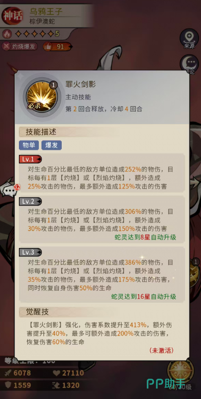 罪火剑影作为乌鸦王子的必杀技,在其中可以带来的单体输出,但是这里的爆发是更强的,主动使用这个必杀技的时候,可以对生命百分比最低的敌方单位造成252%的物伤,对面敌人身上每有1层灼烧或烈焰灼烧的话,会额外造成25%攻击的物伤,最多的时候可以额外造成125%攻击的伤害,所以也是他身上基础的输出数值越高,这里能够爆发的强度越高,蛇灵达到16星的时候技能会对生命百分比最低的敌方单位造成386%的物伤,敌人的身上之前有1层灼烧或者是烈焰灼烧的话,会额外造成35%攻击的物伤,最多额外造成175%攻击的伤害,同时恢复自身伤害50%的生命,强化之后则是变成伤害提升至413%,额外伤害提升至40%,最多可额外造成200%攻击的伤害,恢复伤害60%的生命。