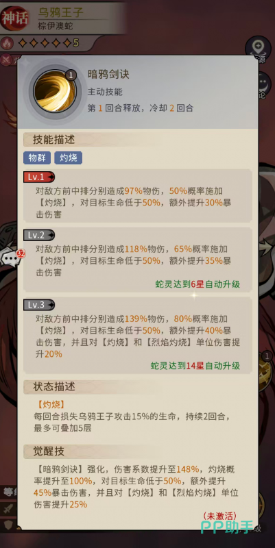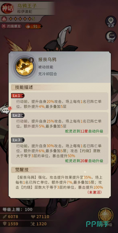 而澳蛇体质是他的被动效果,在上面可以提升20%攻击和10%生命,技能升级之后其中的数值变成了30%和15%,最高的时候还是看等级提升到3级的时候,在上面直接提升40%攻击、20%生命和10%暴伤,有了这个爆伤其实乌鸦王子能够带来的爆发能力就非常强的,这个时期如果是有其他神话品质的角色放在同一个队伍当中,乌鸦王子绝对是当前最强的输出定位蛇灵。