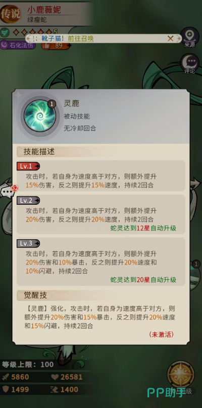 灵鹿是小鹿薇妮最后一个技能,也是被动产生的,是小鹿薇妮在攻击对面时,如果自身的速度数值高于对方,她自己身上则会额外提升15%伤害,反之则提升15%速度,蛇灵达到20星的时候,这个效果会变化成若小鹿薇妮为速度高于对方,则额外提升20%伤害和10%暴击,反之则提升20%速度和10%闪避,所以在这里其实大家要玩好小鹿薇妮的话,在速度属性上面是非常重要的,大家在上面也可以找到更多速度属性强化的蛇灵跟小鹿薇妮进行搭配哦。
