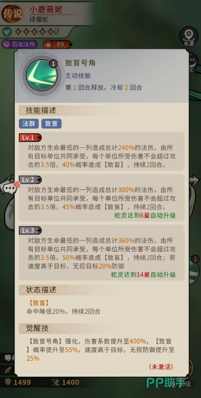 小鹿薇妮在使用自己主动技能的时候可以带来的效果当中包含了石化法伤类型的影响,致盲号角是她的第一个技能,也是可以主动释放的时候带来法群能力的金额梦,使用这个技能可以对敌方生命最低的一列敌人,都造成总计240%的法伤,其中还会有40%的概率造成致盲,持续2个回合的致盲影响在后期随着等级提升而变化,也会有更多倍数的增长,比如到了三级技能的时候,就变成了可以对敌方生命最低的一列造成总计360%的法伤,法力伤害数值增长了但是攻击的范围是没有变化的。