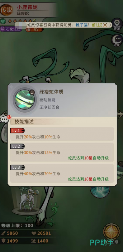绿瘦蛇体质作为小鹿薇妮的基础增益,可以给她带来提升20%攻击和10%生命的数值提升,最多是小鹿薇妮蛇灵达到18星的时候,其中会得到的自动升级变成提升40%攻击和20%生命提升效果,所以这个被动其实在大家升星进行之后,一开始能够给小鹿薇妮带来的提升也不少了。
