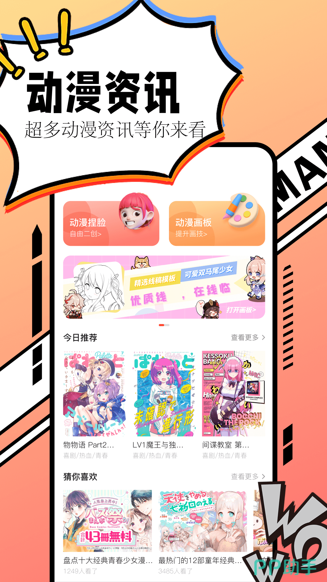 为喜欢漫画和相关爱好者精心打造了一款精品应用,这里汇聚了很多优质内容,能够让大家轻松在动漫世界中畅游,发现很多好玩的作品。还提供了趣味的画板,看完之后如果有想象力就可以在这里直接挥洒描绘出来,充分培养艺术细胞并激发潜能。