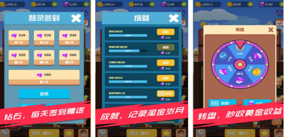 名不经传的小城市当中,很多人都是真正的淘金者,地下有超大的金矿,而且根本挖不完数不胜数,玩家可建造属于你的矿业公司,招募挖矿工人,挖掘黄金积累更多的资源,推送出挂机模式,在离线情况下依旧可自动挖矿,上线之后即可领取收益,在挖掘黄金之后售卖获得更多金币发家致富。