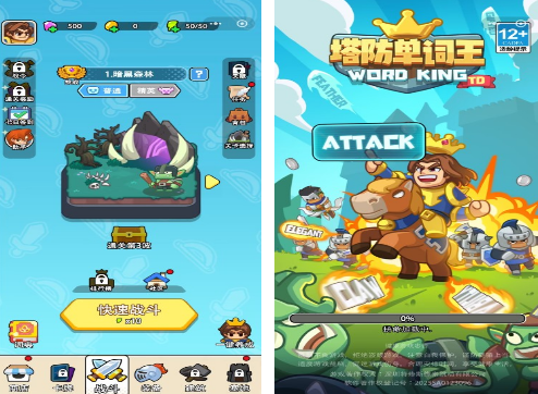 创新融合塔防策略与词汇识别机制。白天阶段侧重防御塔部署与资源管理;夜间阶段则进入单词应答环节——系统随机展示英文单词,玩家须在限定时间内准确点击对应中文释义,答对可获得积分并强化守城能力。双重玩法循环推进,实现策略思维与语言反应的协同训练。
