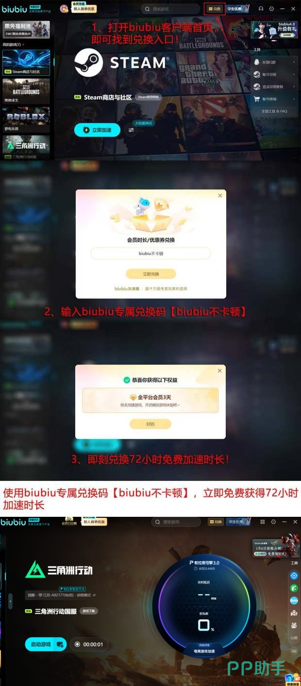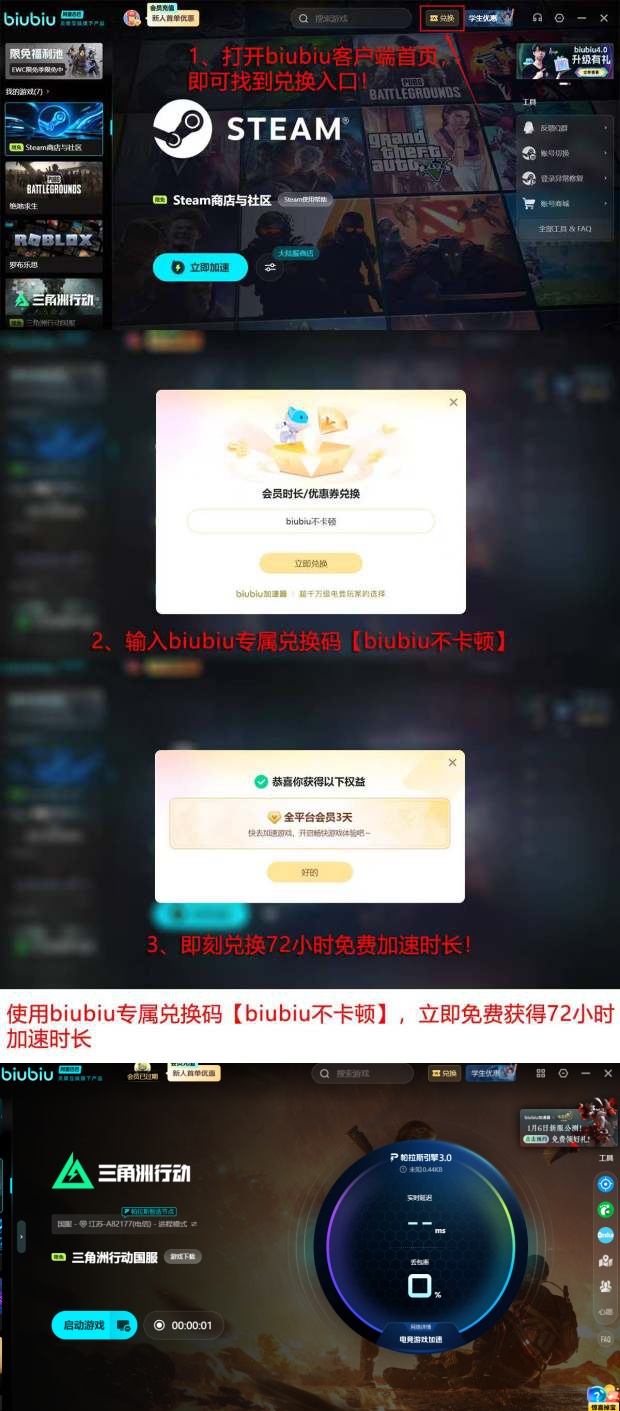 为降低用户尝试门槛,官方同步推出限时福利活动:输入【biubiu不卡顿】兑换码,即可兑换到72小时的加速器时长;同时,新用户的话那还可以领取24小时的免费加速时长,两项叠加后可享一共96小时的免费体验时间,充分满足深度测试与日常使用需求。