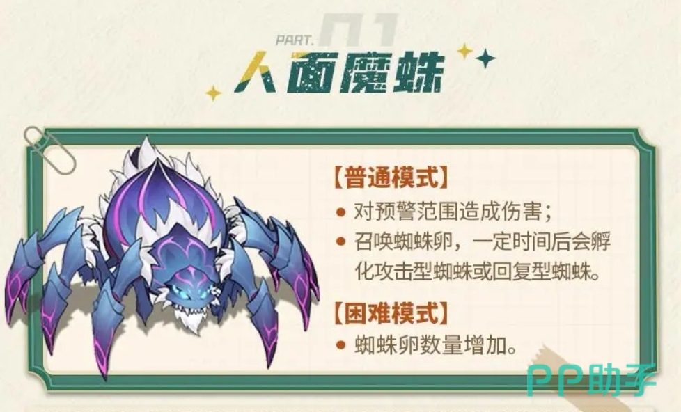 首位登场的是人面魔蛛。在普通难度下,该Boss会释放范围预警技能并对区域造成伤害,同时生成多个蜘蛛卵;部分卵孵化后形成攻击型蜘蛛,另一些则具备治疗能力。困难模式下,蜘蛛卵总数显著提升。应对策略为:优先规避红色预警圈,集中火力快速清除未孵化的蜘蛛卵,尤其需优先处理具有治疗功能的卵体,以遏制其持续续航能力。