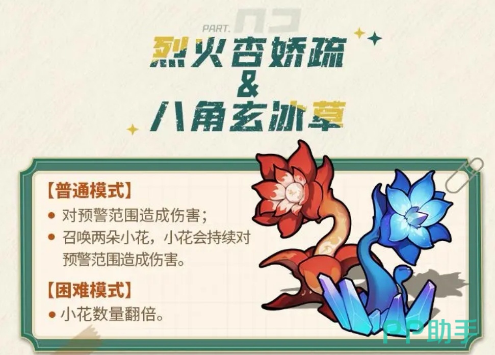 第六位是烈火杏娇疏&八角玄冰草组合Boss。普通难度中,其释放大范围预警技能并召唤两朵攻击型小花;困难模式下小花数量增至四朵。打法重点在于“控场+清杂”双线并行:通过位移或格挡技能规避预警伤害,同时分配DPS资源高效清除小花单位,降低整体承伤压力。