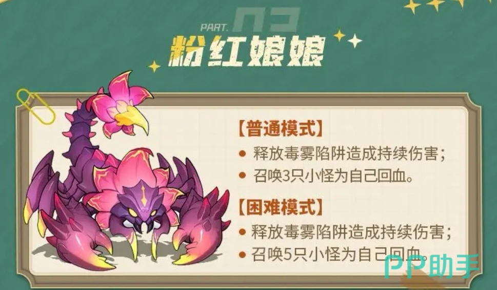 第三位是粉红娘娘。该Boss在普通难度下施放持续毒雾陷阱,并召唤3只辅助小怪为其恢复生命值;困难模式则升级为5只回血单位。核心破局点在于节奏控制——需在毒雾生效间隙迅速清理小怪,打断其回血链路,同时利用地形或位移技能规避毒雾覆盖区,确保主C生存环境稳定。