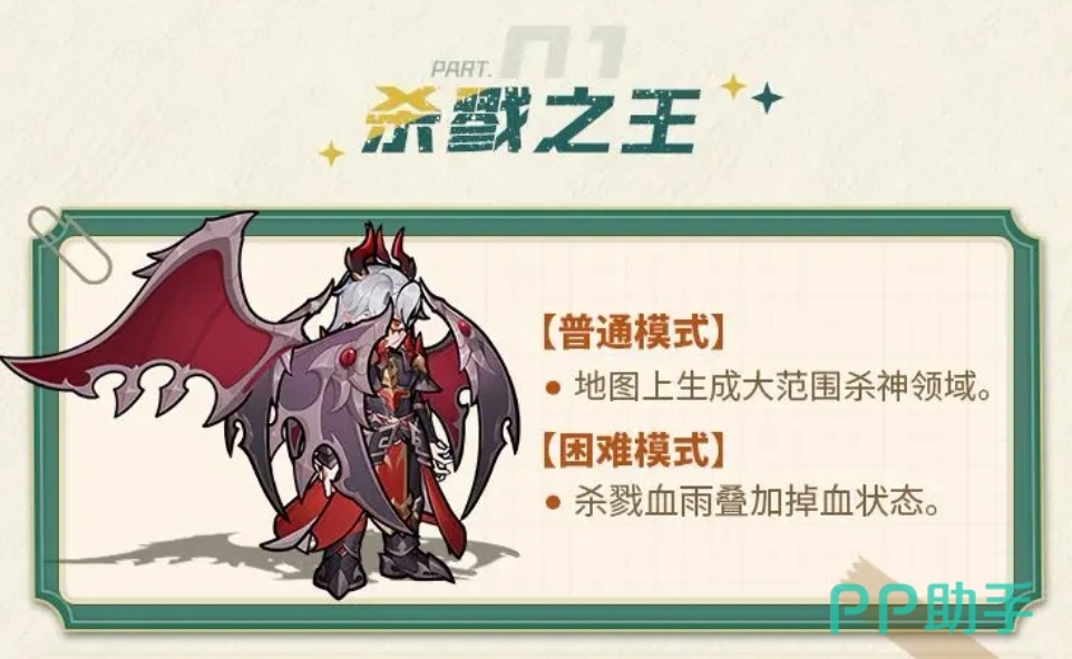 第五位为杀戮之王。其核心机制为“杀神领域”——普通难度下生成固定范围的持续伤害区域;困难模式叠加“杀戮血雨”,使全场角色每秒承受额外掉血效果。应对逻辑明确:始终维持在无领域覆盖的安全区进行输出;困难模式建议配置一名具备稳定治疗能力的辅助角色,以抵消血雨带来的持续减员压力。