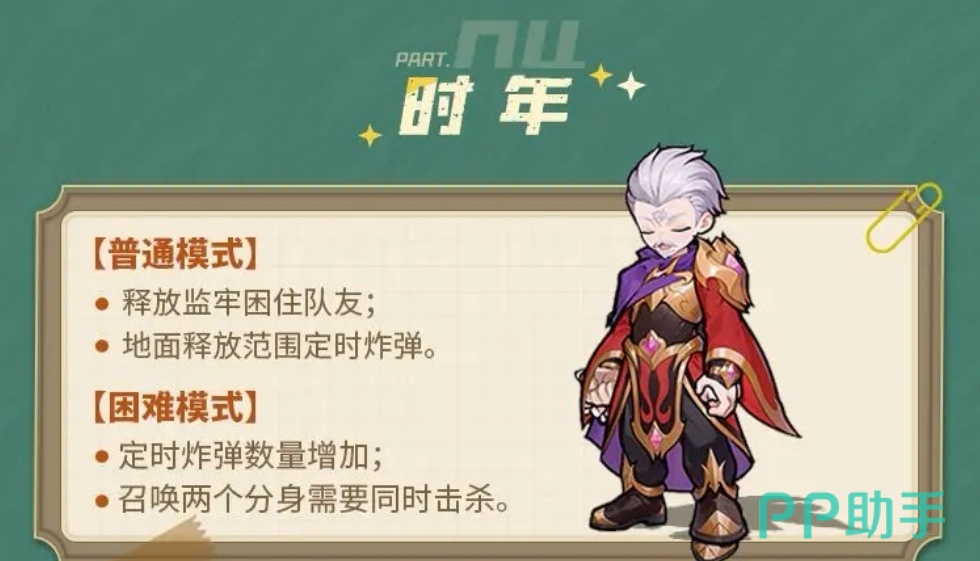 第四位Boss时年,以强控场著称。普通难度中,其可构筑牢狱禁锢我方角色,并在地面布设多枚定时炸弹;困难模式额外增加两具分身,且炸弹密度翻倍。实战中应第一时间解除牢狱控制,救出被困成员;面对分身时,建议采用“压血+集火”策略——先将两具分身同步削减至低血线,再协同爆发秒杀,实现效率最大化。