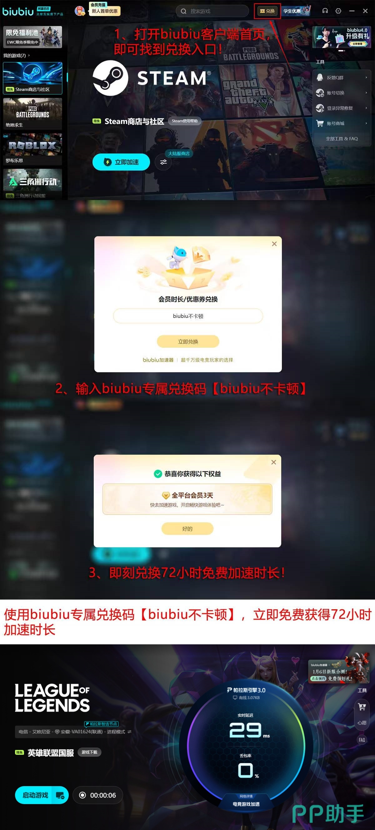 为降低用户使用门槛,biubiu加速器同步推出普惠性体验政策:新用户完成首次注册后,系统自动发放24小时全功能免费加速时长,无需手动领取;老用户亦可凭口令“biubiu不卡顿”额外获取72小时加速权益,叠加后总计可达96小时。覆盖范围涵盖《英雄联盟》在内的主流竞技类与大型MMO网游,兼容性强,部署便捷。