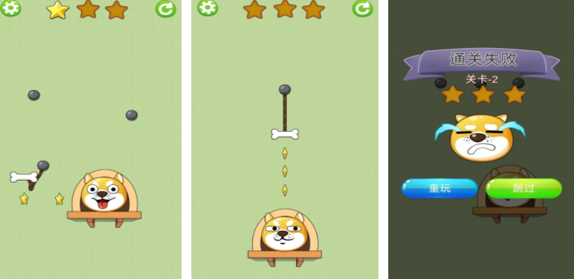 采用竖屏单手操作设计,目标物替换为骨头,接收方为小狗。关卡中散落星星作为评分加成要素,要求玩家同步完成投喂与收集双重目标。随着进度推进,绳结结构复杂度提升,骨头悬挂角度与下落路径呈现更多变量,强化实时判断能力训练。