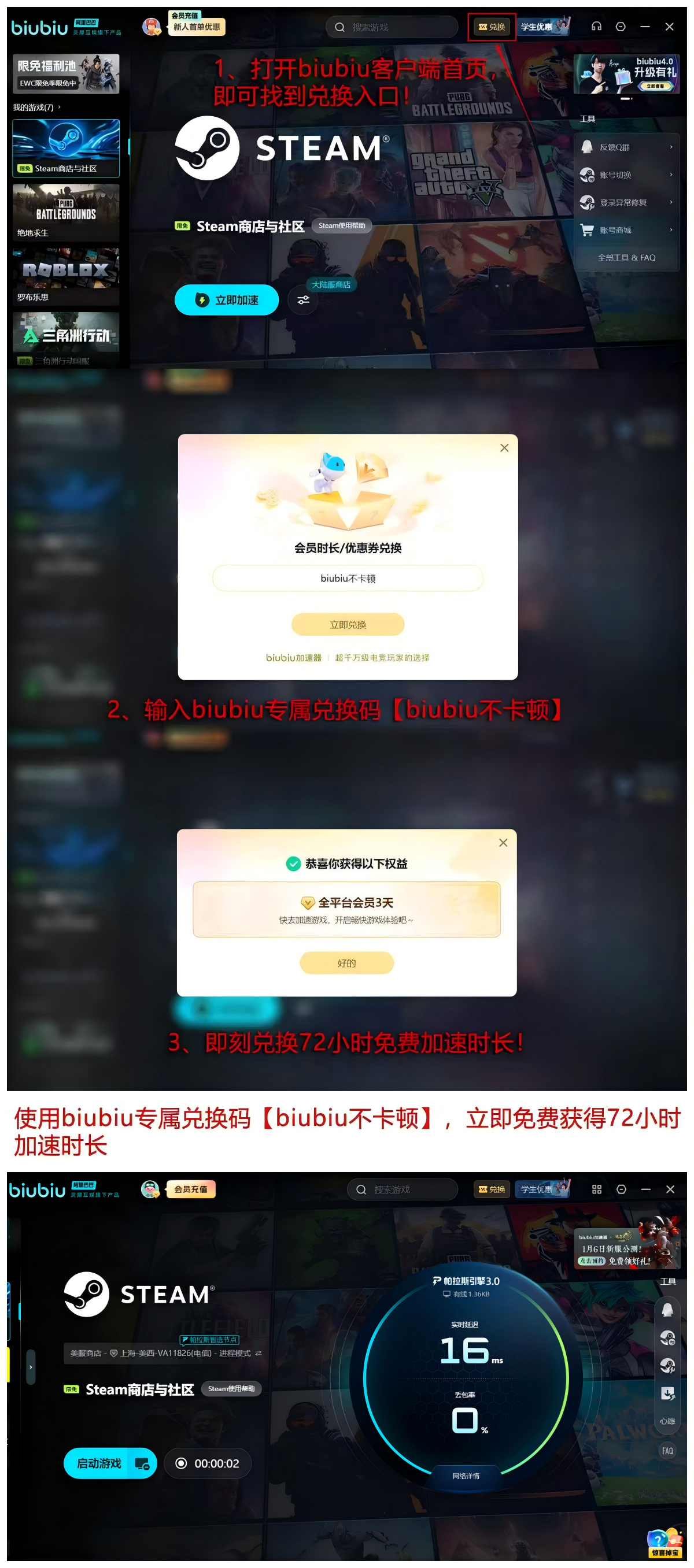 【biubiu不卡顿】新用户注册即可领取72小时免费试用权限,叠加首次激活赠送的24小时专属加速时长,总计可享72小时无限制使用权益。该策略支持先体验后决策,所有功能模块完全开放,无速率限制或节点屏蔽,充分验证产品稳定性与实际效果。