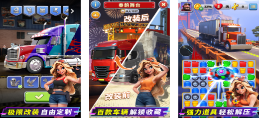 本作打破传统三消框架,将消除机制与载具改装、长途旅行叙事巧妙结合。玩家需通过匹配消除获取卡车零部件,再依据性能需求进行个性化组装与强化。游戏内置百余种可解锁车型及海量配件组合,辅以策略性道具配置系统,显著提升关卡通关效率。双线驱动的设计既保留消除玩法的爽快节奏,又拓展出探索成长的新维度,形成差异化竞争优势。