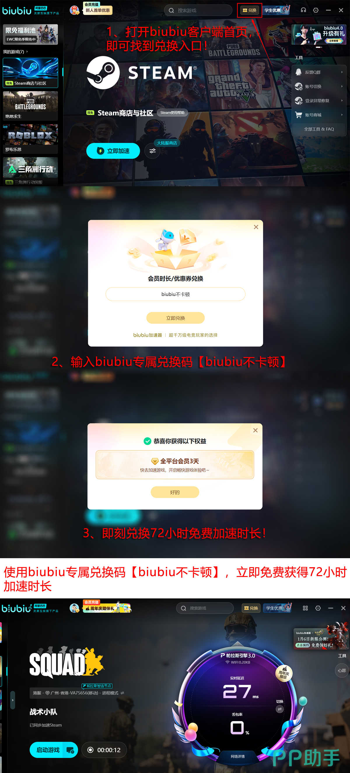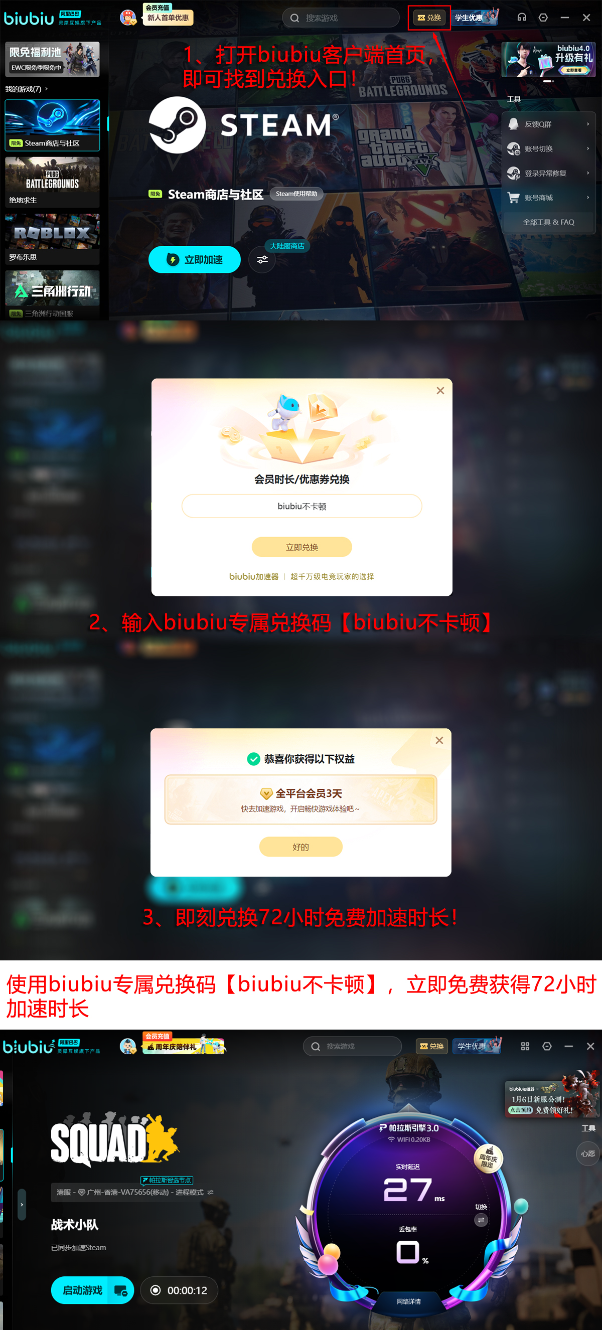 新用户首次使用可享24小时全游戏免费加速权益,用于充分测试连接效果与运行表现;确认适配后,输入专属兑换码【biubiu不卡顿】,还可额外激活3日加速时长,该码面向全部注册用户开放,限用一次。综合计算,新用户初始可获得总计96小时无门槛加速服务,覆盖多数主流战术竞技类游戏的深度体验周期。