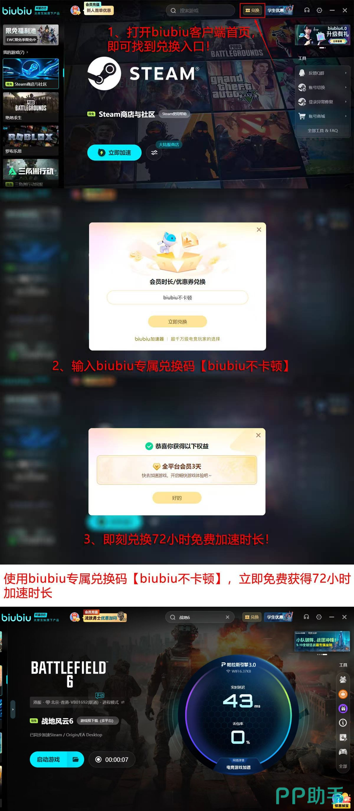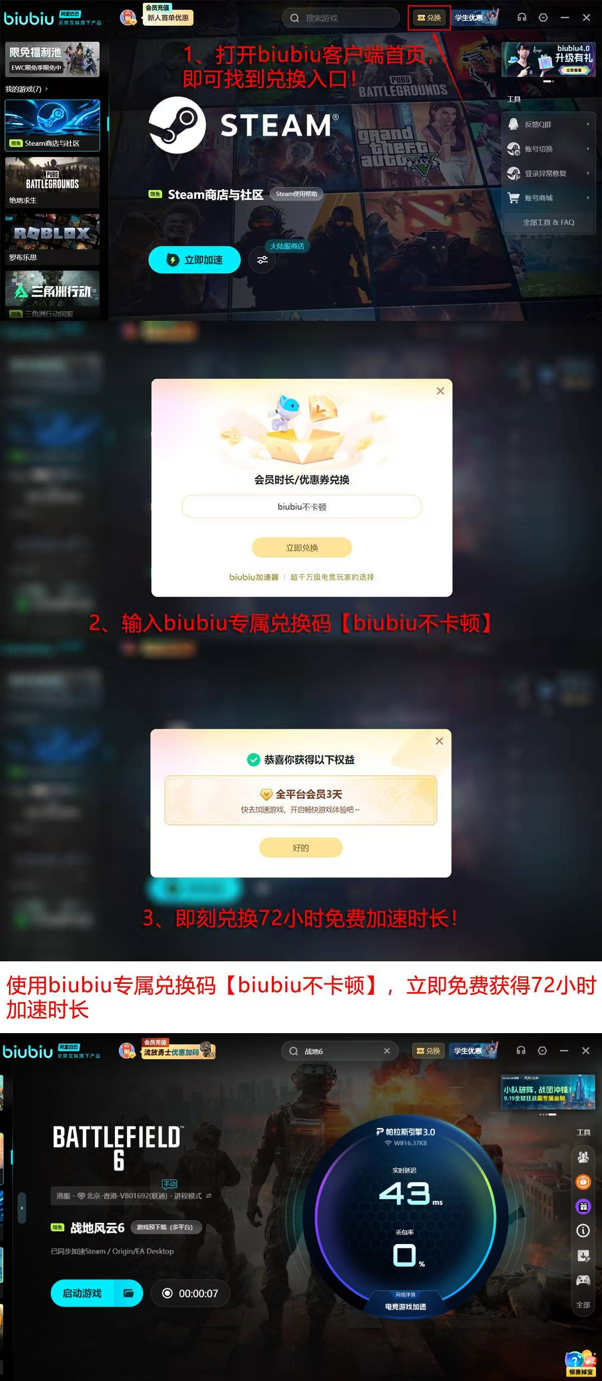 目前平台面向新用户推出限时加速权益:完成注册即可激活24小时全速加速服务;输入激活码【biubiu不卡顿】,额外获赠72小时稳定性增强模式,累计享96小时优先通道使用权。