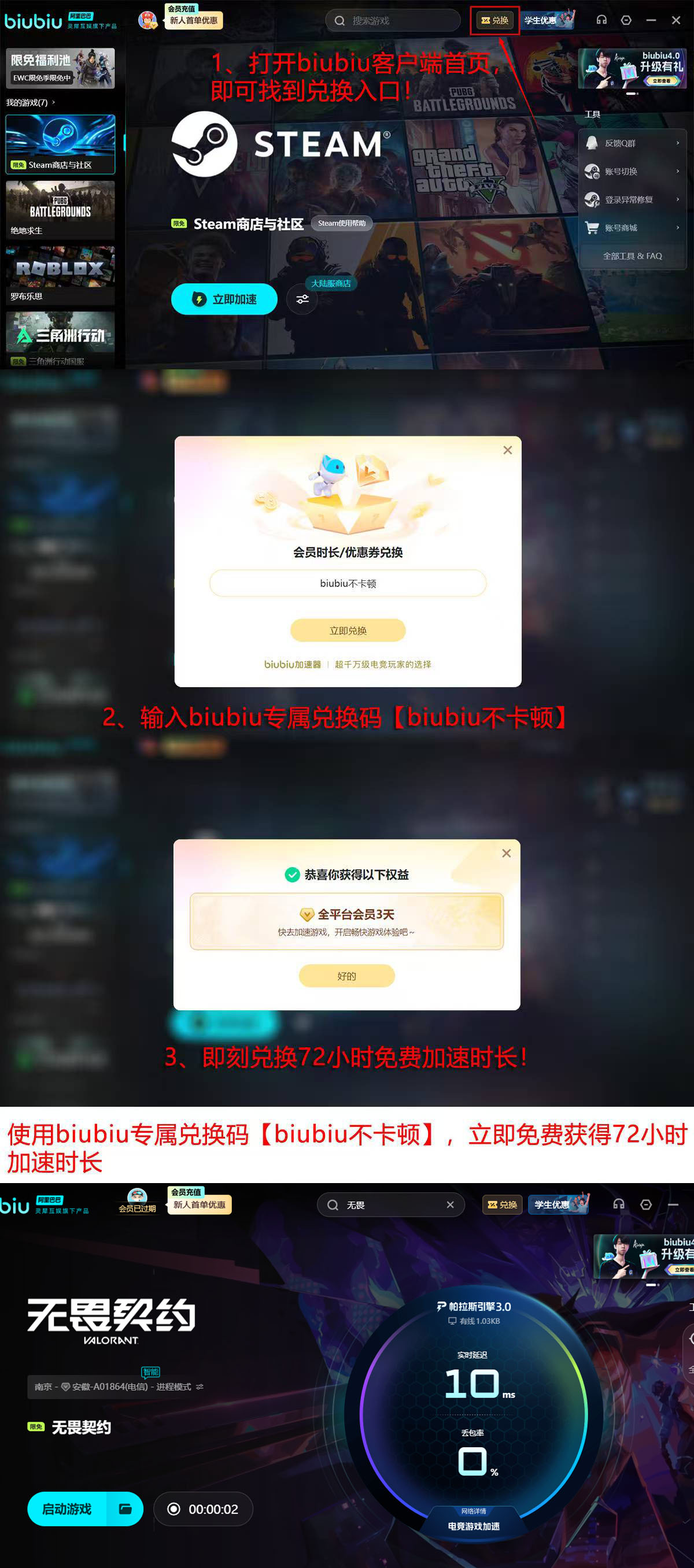 对于新用户,biubiu提供总计96小时的深度体验权益:完成账号注册即可即时获得24小时加速时长;随后进入首页“兑换”入口,输入口令【biubiu不卡顿】,再领取额外72小时服务。全程无需付费,可全面测试其在打瓦不同地图、不同模式(如竞技模式、激斗模式)下的实际优化效果。除高延迟外,由网络波动引发的掉线重连、匹配失败、画面卡顿等问题,亦可通过该方案同步改善。
