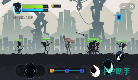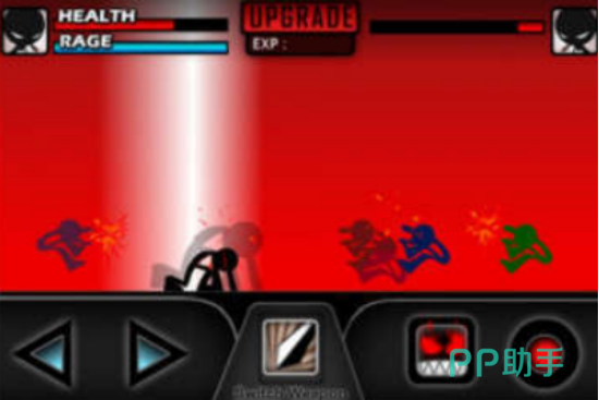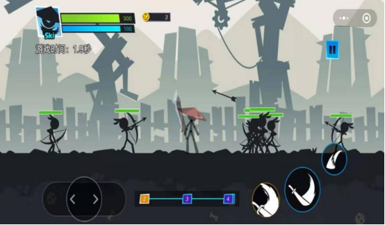 暗黑的画面所展现,特别简单的火柴人却化身成为功夫大师,以横版的形式所展现,在屏幕最下侧都会看到具体的操控按钮,比如挥舞刀剑或者是射击等等。想操控其中的火柴人移动的话,那么就需操控虚拟按键左右移动。还提供丰富的技能体系,包括防御力上升小或者是半月斩等等,当选择自己喜欢的技能之后就可与之搏斗。