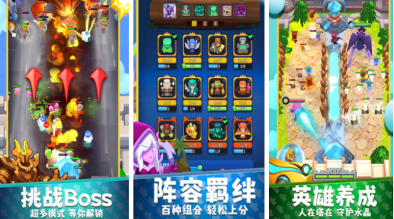 策略塔防为核心,主打就是1v1对战模式,在众多优秀的英雄中,通过收集或者是合成的方式就可组建超强的军团,在英雄中也有兵种羁绊的作用,大家必须了解相互克制的关系,还要正确放置炮塔,积极参与远古迷宫或者是周赛竞技场等不同的玩法中增加可玩性。每局开始之后都会有很多随机性以及不确定性,大家必须要灵活搭配阵容。