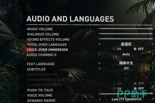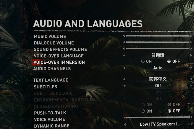 进入到该界面后直接将“voice-over immersion ”和“text language”(配音沉浸和文本语言)中的普通话和简体中文全部设定为打开状态,这样在配音方面和相应的文本语言方面,都可以直接转换成中文了,小伙伴们在体验上就能够变得更加方便,也更有利于世界观的了解。