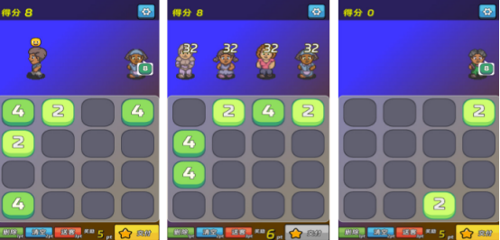 经久不衰的2048合成玩法,此游戏开局后,屏幕最上方会看到4位不同的人物角色头上都有具体的数字,比如32或者是64等等,屏幕最下方又会随机弹出带有数字的方块,通过合理滑动的方式将两个相同数字,相互碰撞即可快速合成,还能将自己的具体分数累积到得分中,看屏幕最上方就能知道自己的成绩。