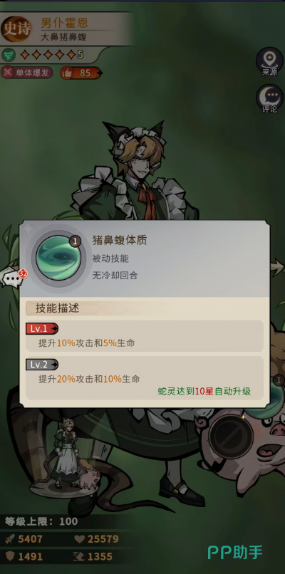 被动天赋“猪鼻蝮体质”提供基础属性增益,初始提升10%攻击与5%生命值,满级后提升至20%攻击与10%生命值。相较于高阶蛇灵动辄30%以上的双维成长,该增幅表现中庸,进一步印证其过渡定位。全技能组共三项(一主动、一必杀、一被动),无额外天赋树或协同技扩展空间,亦无觉醒节点,故不建议投入大量养成资源至高等级或高星级。推荐搭配寂静公主与小丑菲洛组成初期三核体系:前者提供双输出增益与持续治疗,弥补生存短板;后者承担群体破甲与前排压制职能,与霍恩的后排单点形成前后呼应,实现战线覆盖完整性。