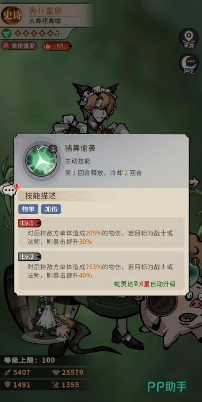 霍恩的一技能“猪鼻偷袭”属于高倍率单体物理伤害技能,基础段造成205%攻击力的物理伤害,命中后排单位时可触发额外机制:若目标职业为战士或法师,则自身暴击率提升30%。该设定使其在常规布阵下(法师普遍居于后排)具备稳定的爆发触发条件。技能升至满级后,伤害提升至253%,暴击率加成同步增至40%。需注意的是,该技能无额外控制、减益或吸血效果,且受限于史诗品质,仅支持一级技能强化,不具备觉醒路径与次级技能拓展能力,因此成长上限明确,适用于中低难度推图阶段。