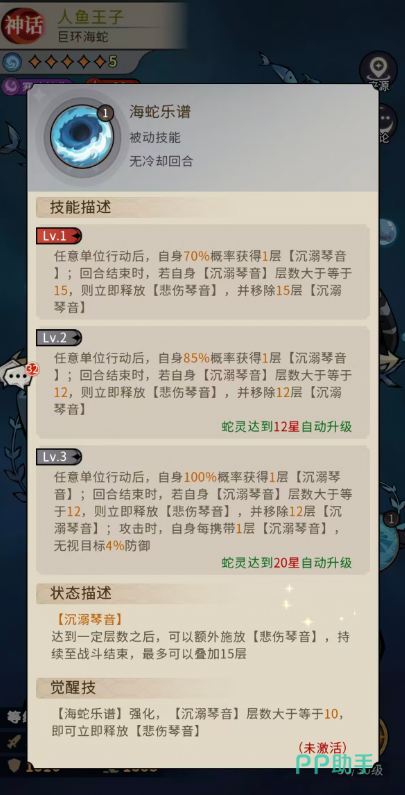 另一关键被动【海蛇乐谱】构建了独特的技能循环机制:每当队友执行行动,人鱼王子有70%概率获得1层【沉溺琴音】;若回合结束时层数≥15,则立即释放【悲伤琴音】并消耗全部层数。该层数上限为15,且每层【沉溺琴音】可提供4%无视防御效果。觉醒后门槛大幅降低——仅需累积≥10层即可触发【悲伤琴音】,显著加快技能释放频率与控场节奏。