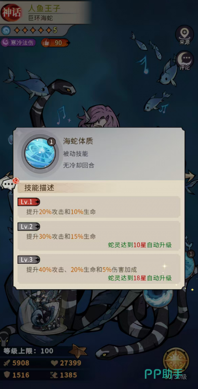 被动【海蛇体质】提供持续属性增益:初始提升20%攻击力与10%生命值;技能三级时增幅扩大至40%攻击力、20%生命值及5%伤害加成,构成坚实的生存与输出基础。