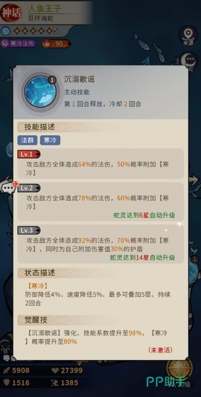 核心主动技【沉溺歌谣】具备稳定群伤与状态压制能力:初始等级可对敌方全体造成64%法术伤害,并有50%概率施加【寒冷】效果;该状态单层降低目标4%防御与5%速度,叠满5层后将显著拖缓敌方行动节奏。升至技能三级后,伤害提升至92%,【寒冷】触发率跃升至70%,并额外为自身生成相当于本次伤害30%的护盾。值得注意的是,人鱼王子仅需达成14星即可解锁技能三级,成长路径高效,觉醒后技能系数进一步强化至98%,【寒冷】附加成功率同步提升至80%。