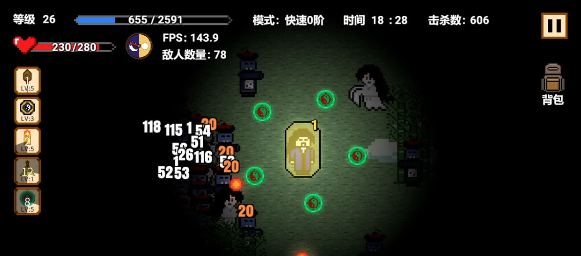 黄袍道士在僵尸围困的丛林中求生,游戏里面的角色会自动攻击周围敌人,玩家通过走位躲避伤害。战斗中可以释放剑阵类法术,操作门槛不高,但需要考虑站位。技能树分为攻速和法术两个方向,击杀僵尸得到的铜钱能强化御剑术,还可以解锁连锁效果。场景里能捡到镇魂铃还能让僵尸定身,道具搭配会产生让你意想不到的连招。