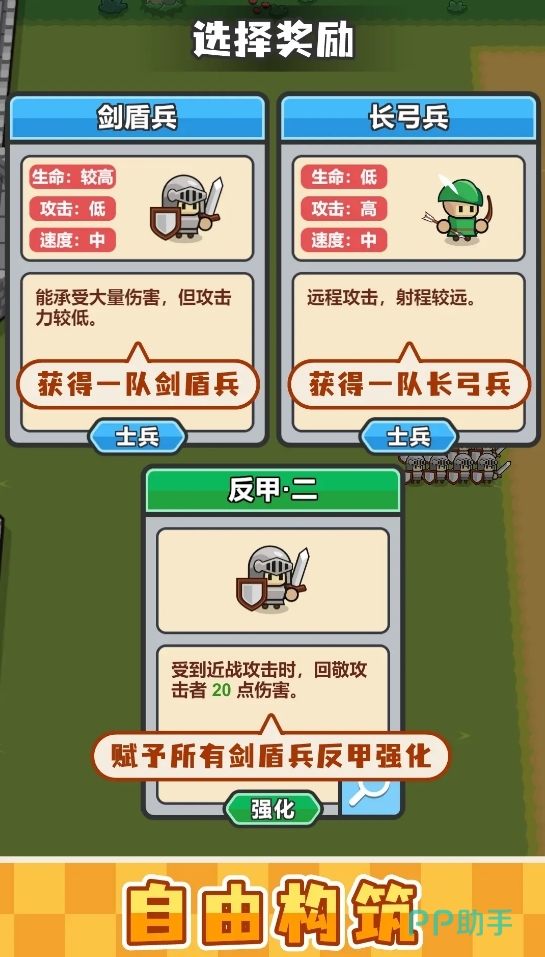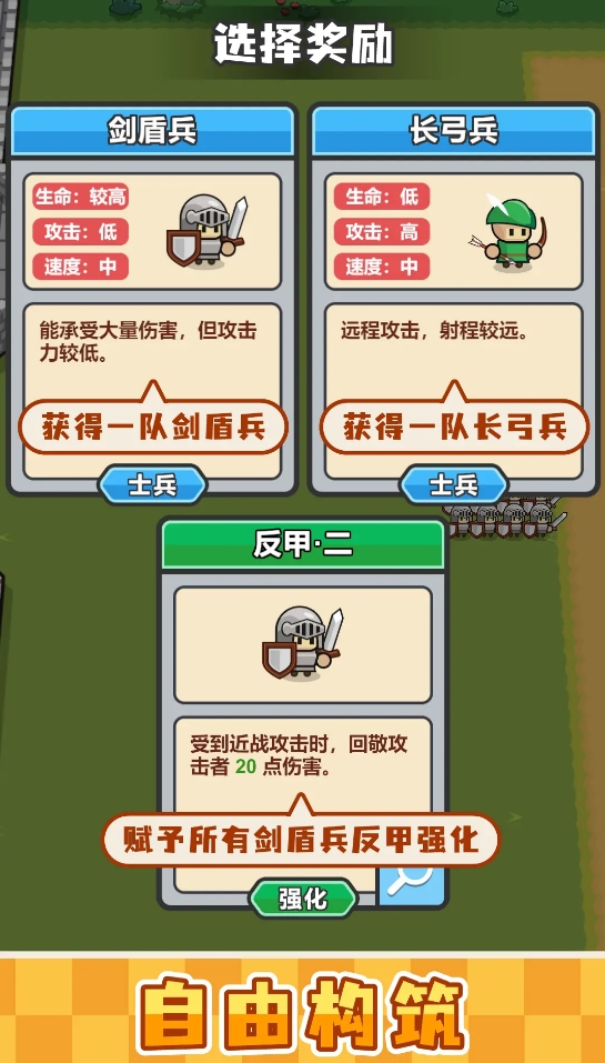 《小兵三选一》可任由玩家们挑选兵种并进行阵容布置,从而在两军模拟对弈的战场上力压对手赢下战局。它里边的关卡有多个不同的轮次,且每个轮次的敌人都要比前一轮次更具挑战性。每个轮次开始前,玩家都能从三种不同的兵种中选择其一作为自己的兵力补充,还能根据各兵种的特性去布置他们的站位,让军队能更好地在作战中展开阵型,以更为立体的战术策略来与对手作战。