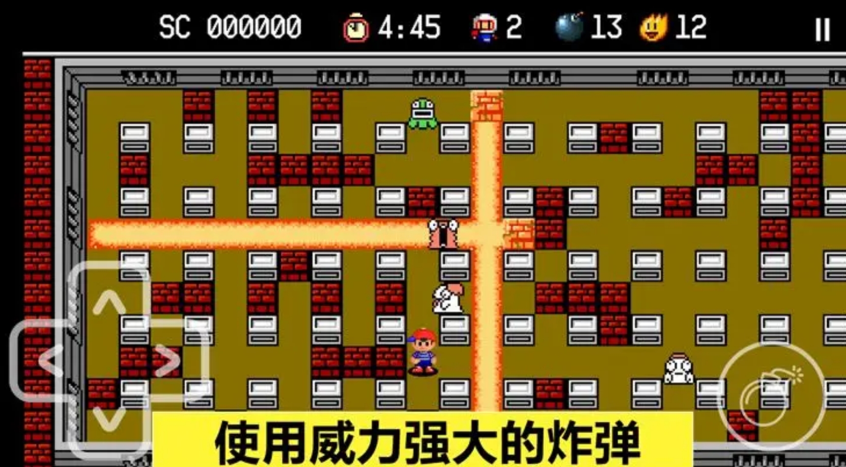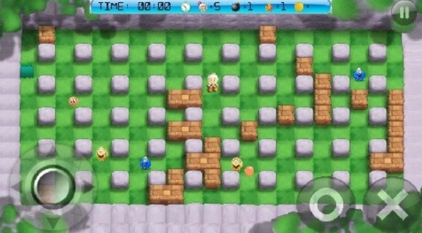 本作在玩法上与红白机上的经典炸弹人差别不大,都需要玩家们去操控炸弹人完成关卡内的挑战,消灭掉全部的敌人后才能过关,但若是自己与敌人撞上,则会损失生命,一旦全部的生命都损失掉,那唯有重新再进行挑战。左边摇杆控制炸弹人移动,右边按键进行炸弹放置的操作很符合移动端玩家们的习惯,而且还可随时在设置中调节按键的位置,让每位玩家都可享受到舒服的操控体验。