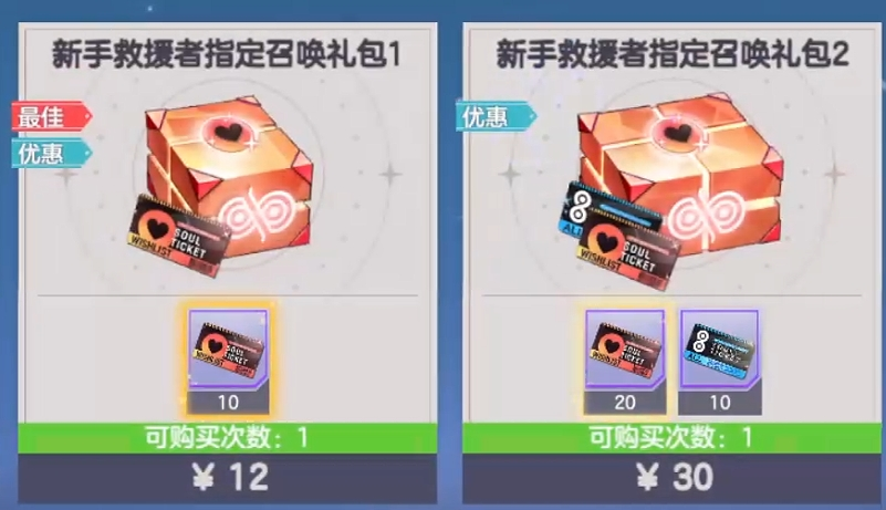 建议购买顺序:任意0.01元档位礼包优先于12元【新手救援者指定召唤礼包1】,后者又优于30元【新手救援者指定召唤礼包2】;而198元【新手救援者天使型精灵召唤礼包】与同价【新手救援者恶魔型精灵召唤礼包】并列第三级,其余礼包暂不推荐。