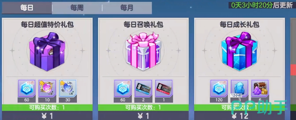 含每日、每周、每月三种周期性礼包,购买次数随周期刷新。具体推荐如下: