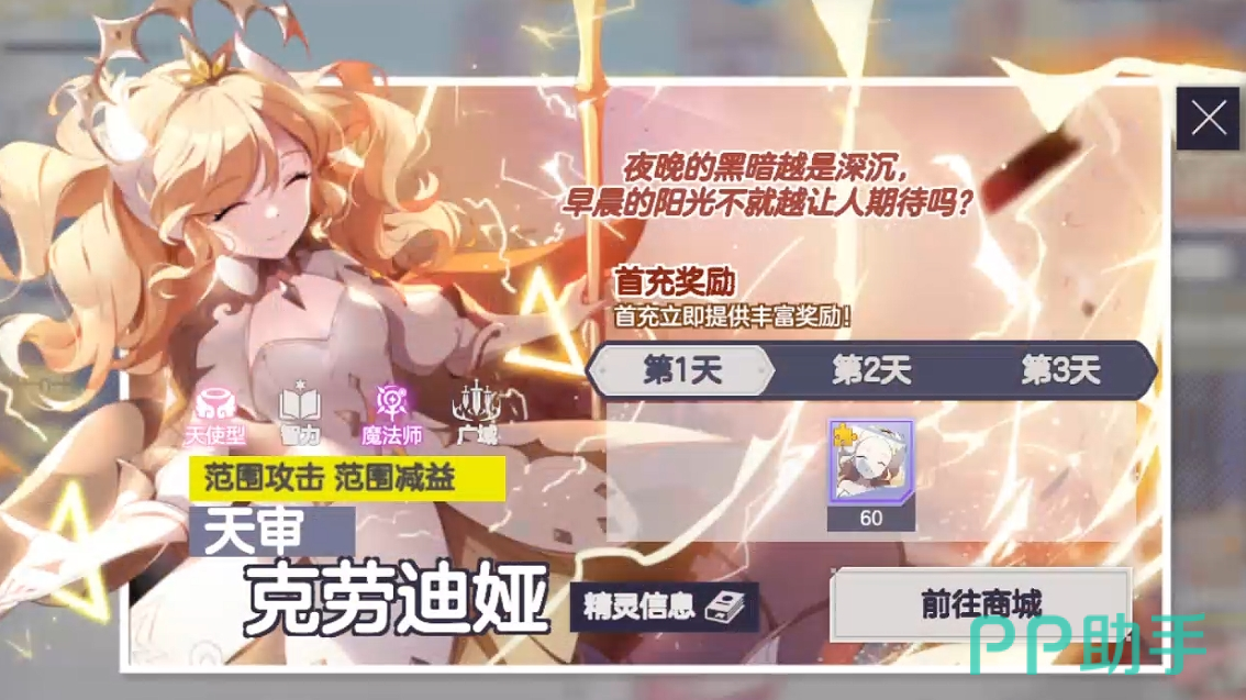 完成任意【新手救援者礼包】(即首充礼包)购买后,即可激活三日连续领取机制。总计可获取120枚【精灵的记忆:克劳迪娅】,足够合成两位完整【克劳迪娅】;此外还将获得【遗物召唤券】、【幸运花束】及【套装饰品选择箱子(传说+)】。