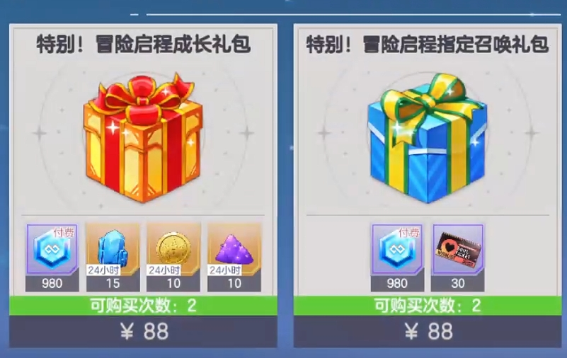 88元【冒险启程指定召唤礼包】为最优选择,其次为同价【冒险启程成长礼包】,其余同系列礼包暂不建议优先采购。