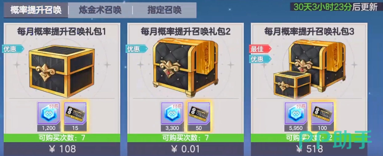 分为【概率提升召唤礼包】、【炼金术召唤礼包】与【指定召唤礼包】三类,每月重置购买次数。所有0.01元档位礼包享有最高优先级,其余按性价比排序。