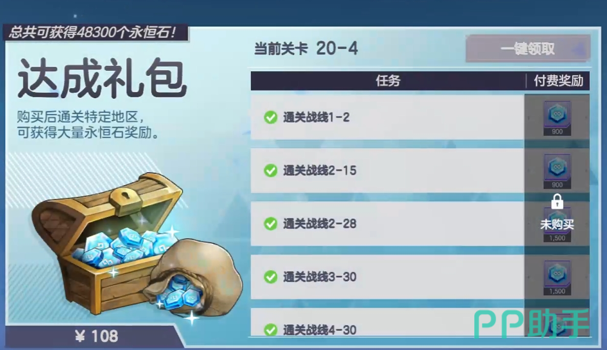 售价108元,需通关指定战线关卡后逐项领取。全部目标完成后,共可获得48300枚【永恒石】,单位价格兑换效率显著高于常规资源获取途径。