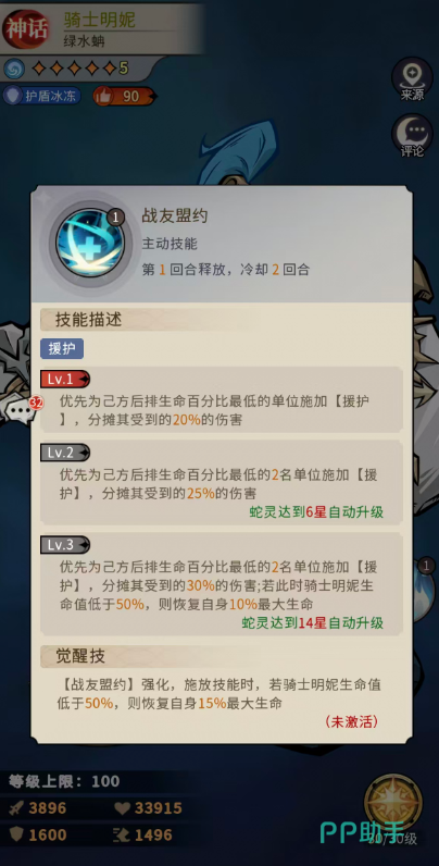 主动技能【战友盟约】是骑士明妮站稳前排的关键。首回合即可释放,优先为己方后排生命百分比最低的1名单位施加【援护】,分摊其20%所受伤害。当蛇灵升至14星后,该技能自动升至3级:作用目标扩展为后排生命最低的2名友方,分摊比例提升至30%,且若骑士明妮当前生命低于50%,还将恢复自身10%最大生命值。觉醒后进一步强化——生命低于50%时,恢复量提升至15%最大生命,显著改善前排续航能力。在治疗职业尚未成型的前期阶段,这一自愈+减伤组合使其存活率远超常规坦克。
