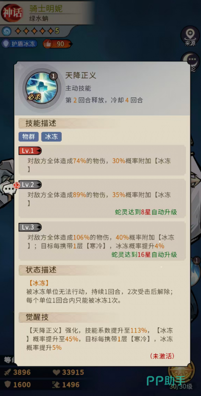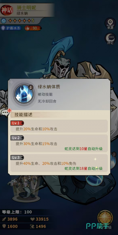 被动【绿水蚺体质】提供基础生存保障:初始增加20%生命与10%攻击;蛇灵达18星后,升级为+40%生命、+20%攻击、+10%免伤。其中【免伤】属性直接强化其前排抗压能力。另一被动【猎物气息】则支撑其控场独立性——受到敌方攻击时,60%概率对攻击者施加1层【寒冷】,无需依赖队友即可自主叠层,为后续冰冻创造条件。
