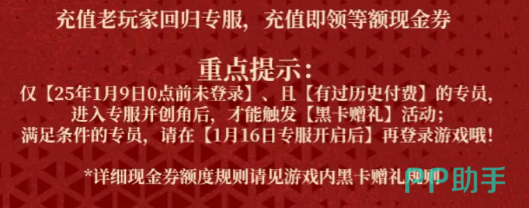 参与黑卡赠礼需同时满足两项硬性条件:其一,账号最后一次登录时间不晚于2025年1月9日0:00;其二,历史账单中存在至少一笔有效充值记录。符合资格的玩家,须于1月16日庆典专服正式开放后,在该服务器内新建角色并完成首次登录,系统将自动识别并激活赠礼资格。特别提示:切勿提前在原服务器登录或操作,否则可能导致资格判定失败。