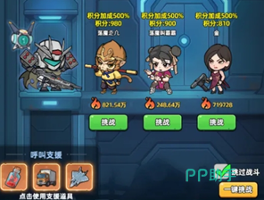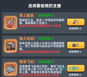 进入到活动里面以后,是允许大家适用支援道具的,游戏中能够让大家使用的道具分贝是肾上腺素、撞大运咯以及霉军飞机,肾上腺素主要是在自身挑战死亡以后,有一次复活的机会,还能随机刷出3个对手,撞大运咯则能够直接将最强的三个敌人给秒杀掉,死亡以后虽然能够复活,氪疲劳值却不会恢复,霉军飞机,则能够召唤出霉军飞机轰炸对人。