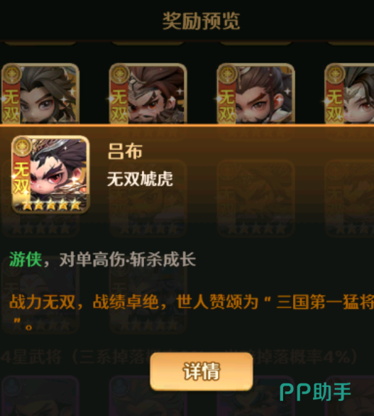 角色还有一个名叫无双飞将的技能,对方有一名成员死亡,玩家就能恢复8%的生命值,一技能触发伤害之后还会再次攻击生命值低于10的对手,这个技能的被动效果就是,可以在每一次攻击之后提升角色15的防御能力和事物的攻击能力,最多可以叠加10层,要想获得吕布的话就可以去求贤阁抽取,作为一个游侠角色,搭配起来是比较万能的,可以和张飞,马超这样的战斗角色搭配,你可以和孙尚香或者吕玲绮搭配。