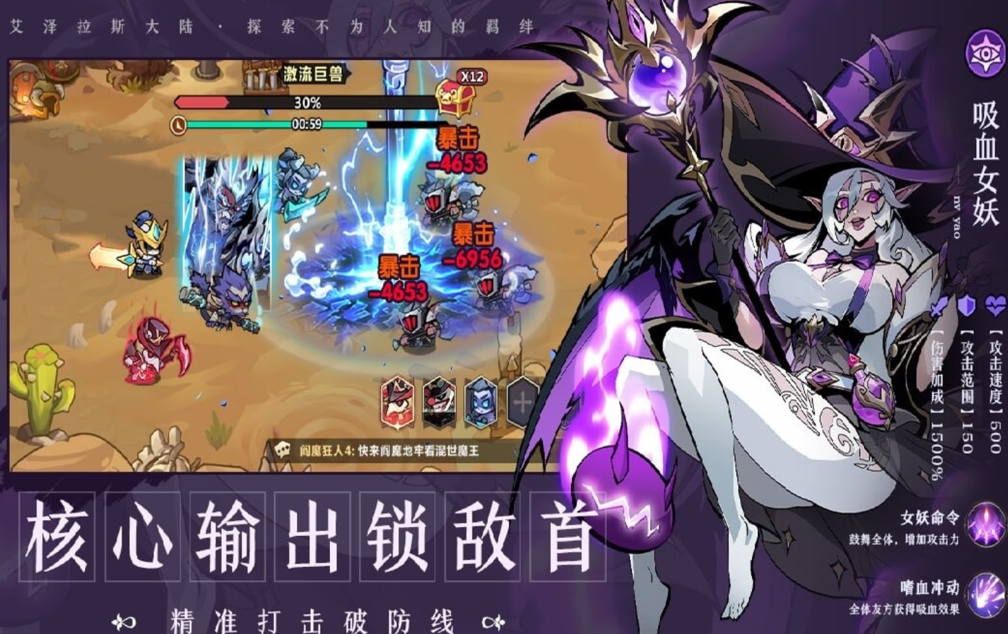 其次就是阵容的变动,以及策略性布署是战争胜利的主要原因。经过一定的积累以及游戏的深入之后,玩家可以改变一些英雄以提高战斗力。中期可以将其改成巫妖和吸血女妖,后者给群体增伤并加召唤物效果,前者有单体治疗、复活的能力,在中期战斗中更为稳定。合理安排站位并按照正确的技能释放顺序,就是对付复杂副本以及高难度关卡的要点。