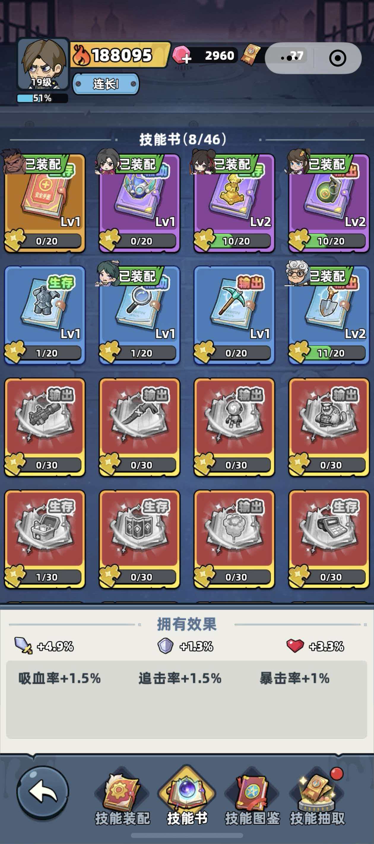 想要提升角色战斗力除了给角色升级以外,使用技能书也是重要的方式之一,玩家获取的技能书越多,那角色的战斗力也就会越强,游戏中当前的技能书一共分为输出、辅助、生存三大类,而技能书又分成了金红色、红色、橙色、紫色以及蓝色等多个颜色,金红色的技能书是品质最高的神话+级别,红色为神话级别、橙色为传说、紫色和蓝色的话则分别是史诗和精良,技能书的品质不同装备上所产生的效果肯定也是不同的,给角色带来的属性加成也是不一样的,大家需要根据角色的定位来选择合适的技能书才行。