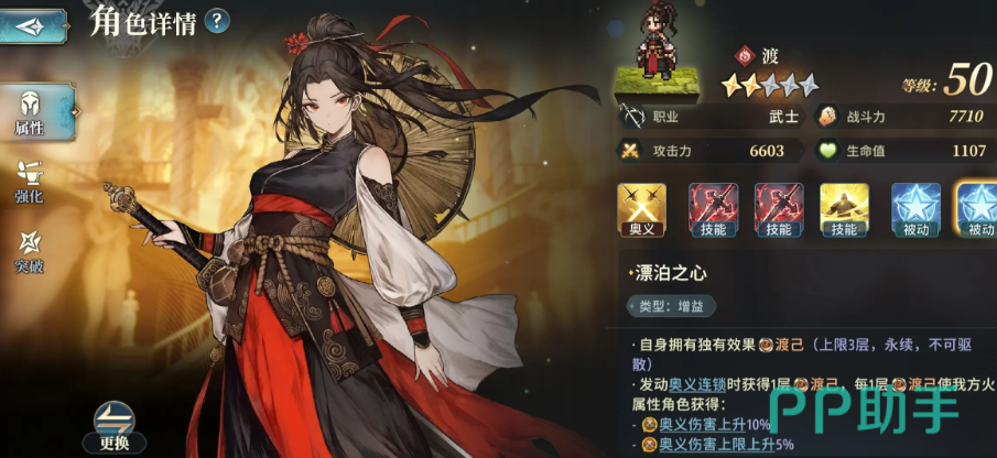 次要的C位角色,可以使用渡,其角色定位是武士,同时附带有很强的技能强化被动,可以根据自身拥有的标记数量,来增加奥义伤害和奥义伤害上限,整体技能输出可圈可点,虽然前期的表现不佳,但是在后期的叠加到指定层数后,可以得到强化的输出转化率。