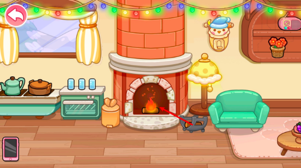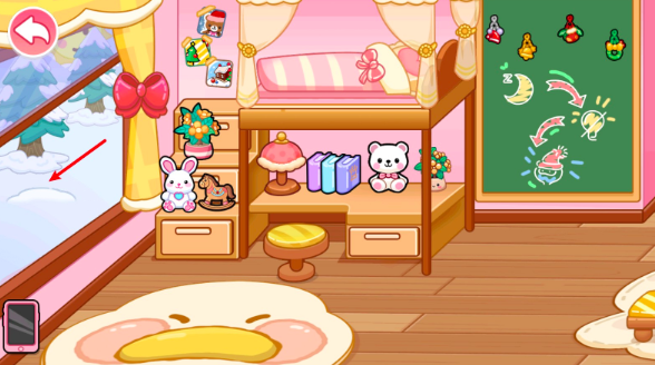 在圣诞主题的房间当中还有一个小彩蛋,小编在下图当中进行了标注,玩家将页面向左侧滑动可以看到一个壁炉,此时放进去一块木头就可以将壁炉自动点燃,看起来是不是更加温馨了呢?玩家还可以在墙上挂上顺路钟表和五颜六色的彩灯,圣诞节氛围就更浓了。