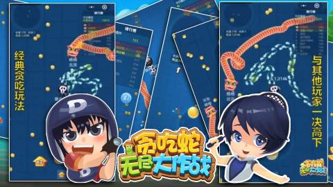 这款《贪吃蛇美食大作战》手游的多人在线竞技的玩法是比较热门的,简洁的控制方向还是很容易被掌握,游戏内的特色主题场景的元素还是很生动的,玩家们可以依靠小队战术来完成包夹,从而击败强大的敌人,连续的吞噬可以让蛇蛇短暂的开启无敌的效果,多维度的数据分析很清楚。