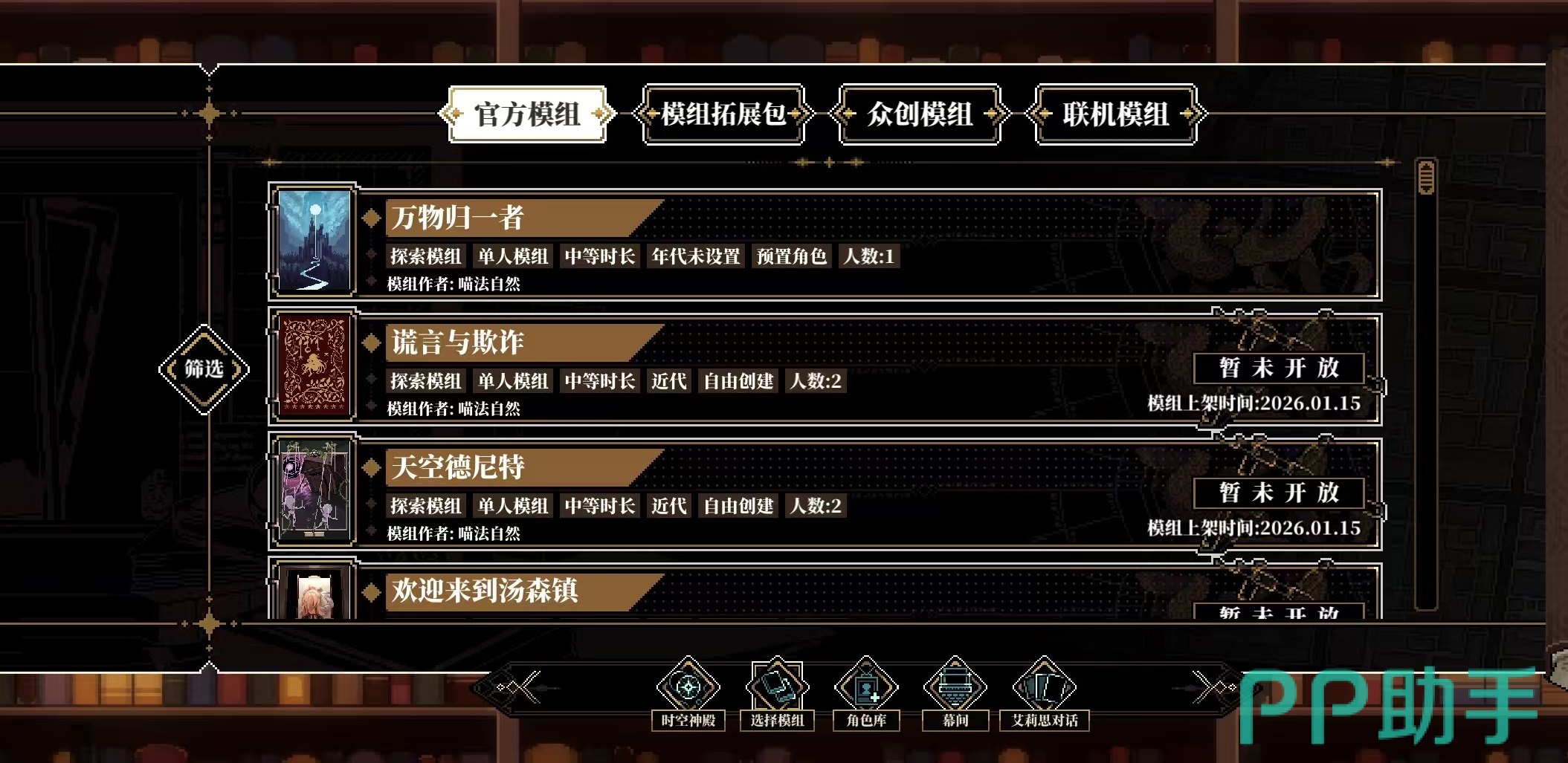当前接入的模组题材覆盖广泛:中世纪克苏鲁风格古堡、现代都市陷阱迷局、近未来星际殖民地等多元设定并存。各模组虽独立成篇,但共享同一时间本体论框架——外神干预引发的时间褶皱,构成所有事件的底层动因。每个模组内含数十种结局路径,玩家选择直接影响角色关系、世界状态与终局走向,真正实现“选择塑造现实”的沉浸式叙事逻辑。